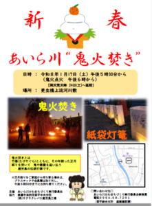 正月飾りを大やぐらに組んで燃やし、その炎で悪霊(鬼)を追い払い、1年の無病息災や家内安全を祈る"鬼火焚き”が開催されます。